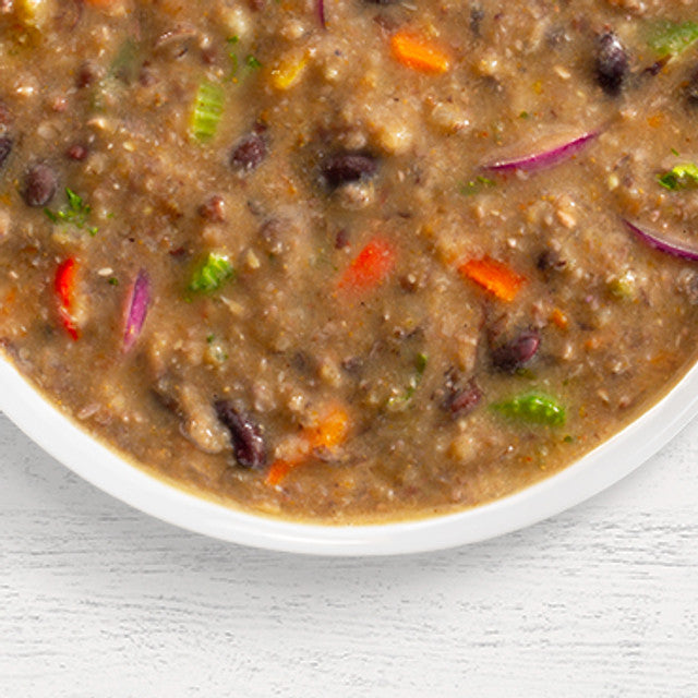 Ingredientes: Frijoles negros, guisantes de ojo negro, zanahoria, cebolla, comino, pimiento morrón, apio, chalota, laurel, cayena.